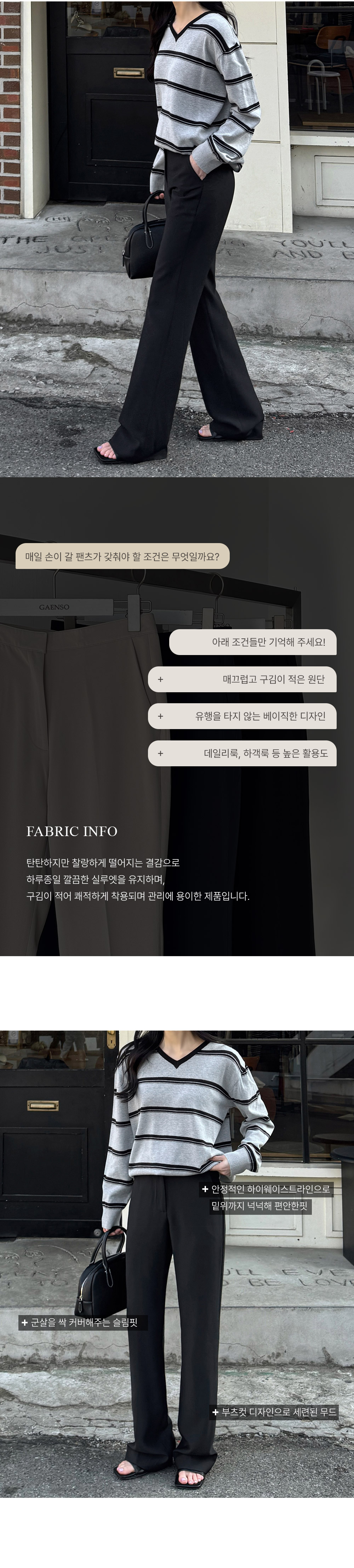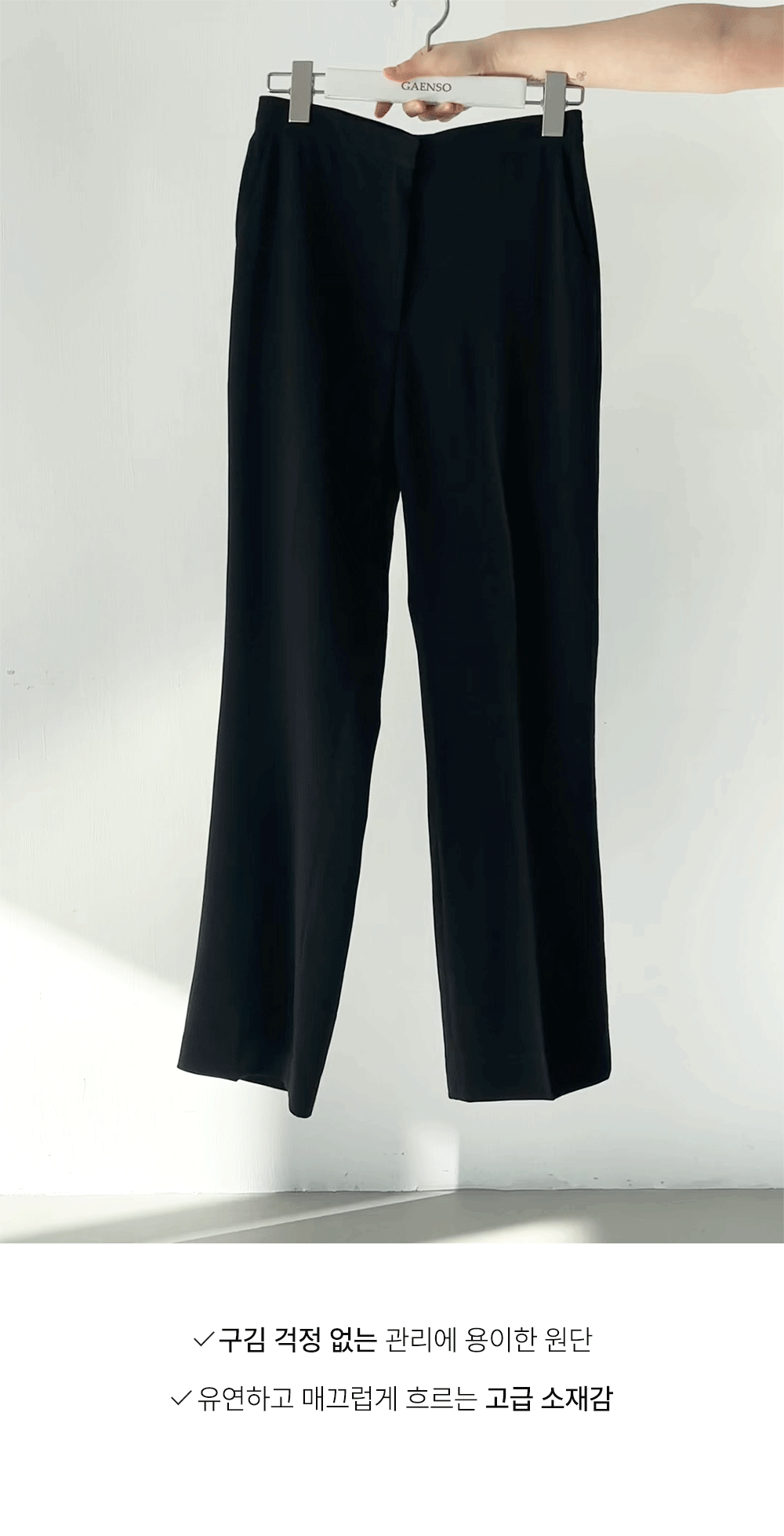 포멀한 분위기로 세련미 있게 매치되는 슬랙스! 세미 부츠컷 디자인으로 슬림하고 롱한 레그 라인이 연출되며 하이웨스트 밑위로 안정적이에요~
