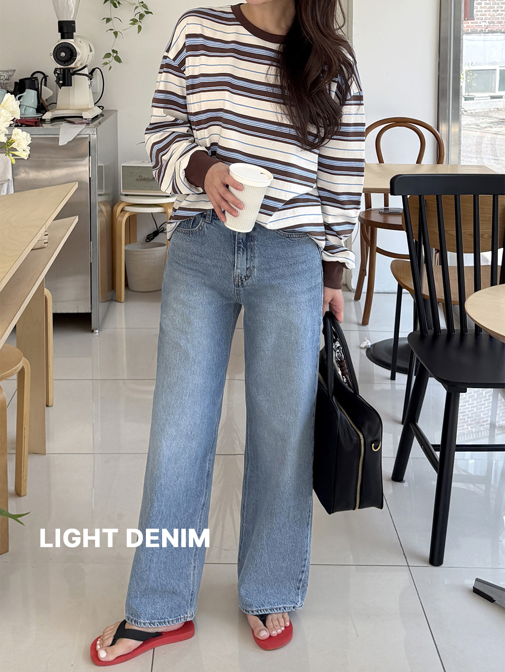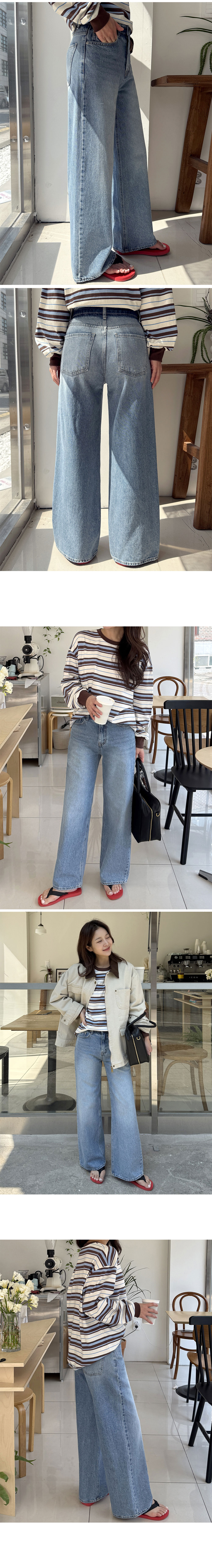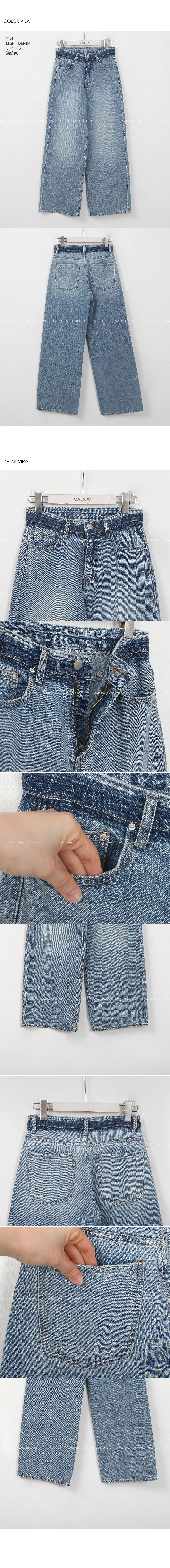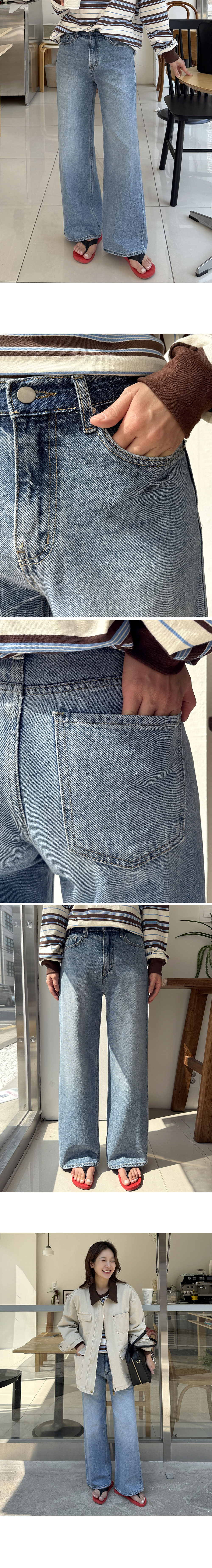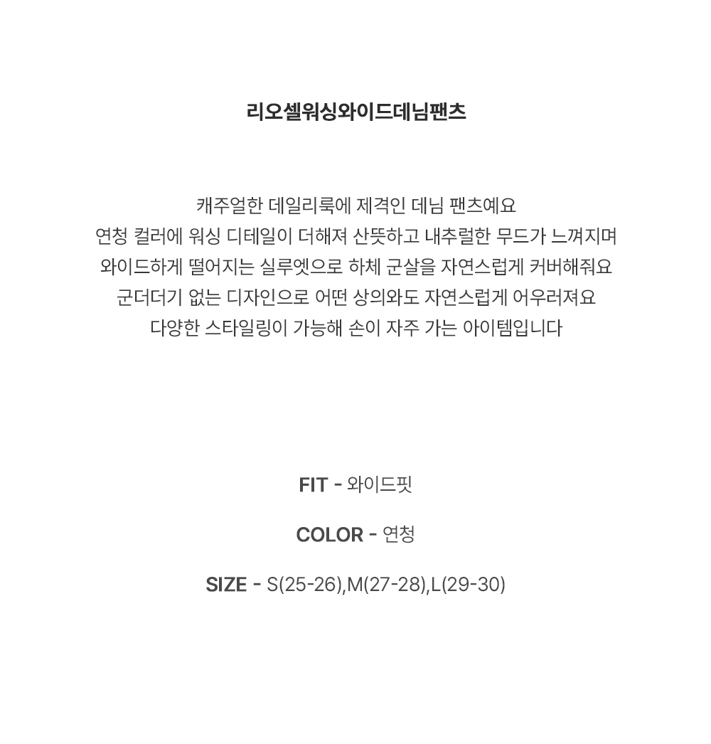 연청 컬러에 워싱 디테일이 더해져 산뜻하고 내추럴한 무드가 느껴지며 와이드하게 떨어지는 실루엣으로 하체 군살을 자연스럽게 커버해줘요:D